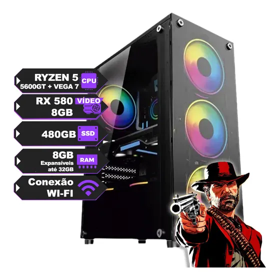 PC Gamer Completo Ryzen 5 5600GT Placa de Vídeo RX 580 8GB 8GB RAM SSD 480GB Com Wi-fi Ideal para jogos em alta performance e excelente custo-benefício