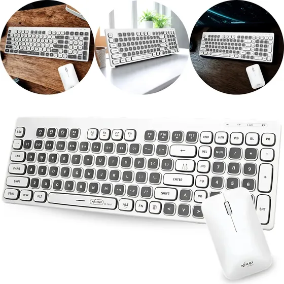Kit Teclado e Mouse Sem Fio multimídia ultra silencioso. Design ergonômico moderno na cor branco com preto. Conectividade imediata e ideal para longas jornadas de trabalho ou estudo.